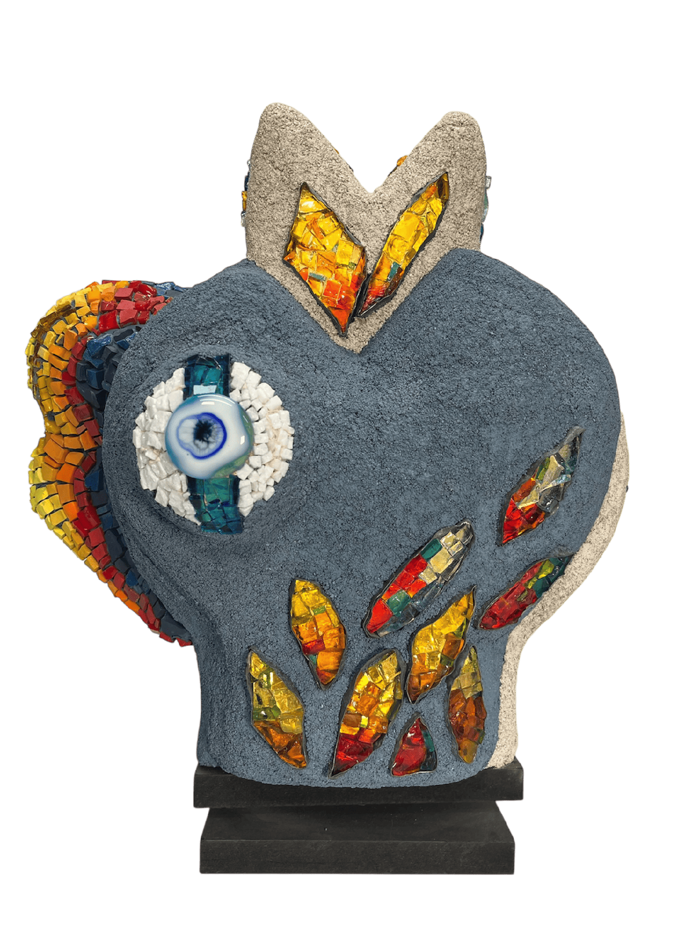 Chaque élément de la nature porte en lui les stigmates de cet envahissement: métal récupéré, pierre font partie intégrante de chaque créature. Les couleurs, souvent intenses et lumineuses, évoquent l’énergie de la ville tout en célébrant la richesse du monde naturel. L’or, le verre et les reliefs captent le regard et transforment chaque pièce selon l’angle et la lumière.